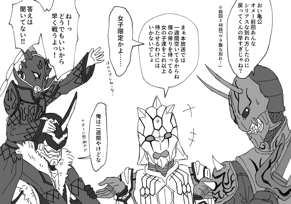 ライダー4人いる(レンゲルは中盤からの登場ですが)という事もあってか、ライダー同士の戦いが多くて、自分的にそこは若干しんどいかな……。ライダー以外でも、特に序盤のほうは登場人物が皆ピリピリ&関係もギスギスしてて、正直途中で心折れそうでした。