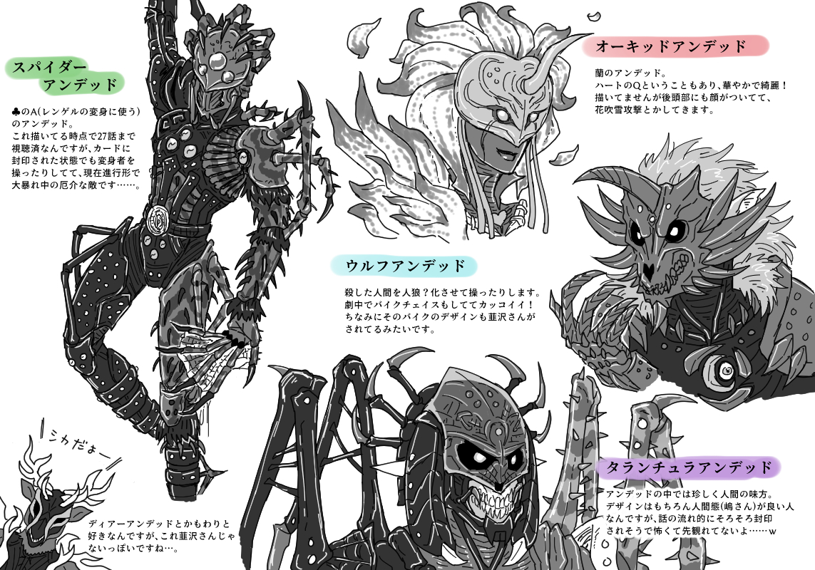 アンデッドのデザインは全部韮沢さんかと思ってたんですが、一部他の方がデザインされてるのもあるみたいですね…。調べた感じだとディアーとゼブラは韮沢さんじゃないっぽい。(他にも居るかも…)