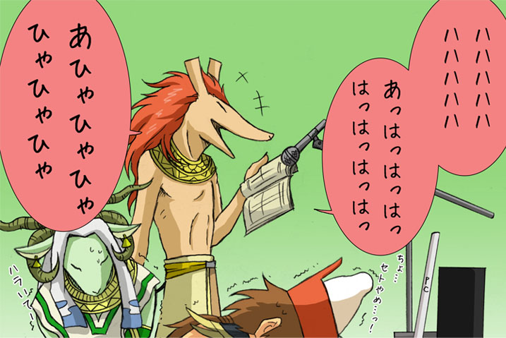 本当は普通に大笑いするシーンなのですが、照れと長時間の録音疲れのせいか何故か悪役笑い(?)に。