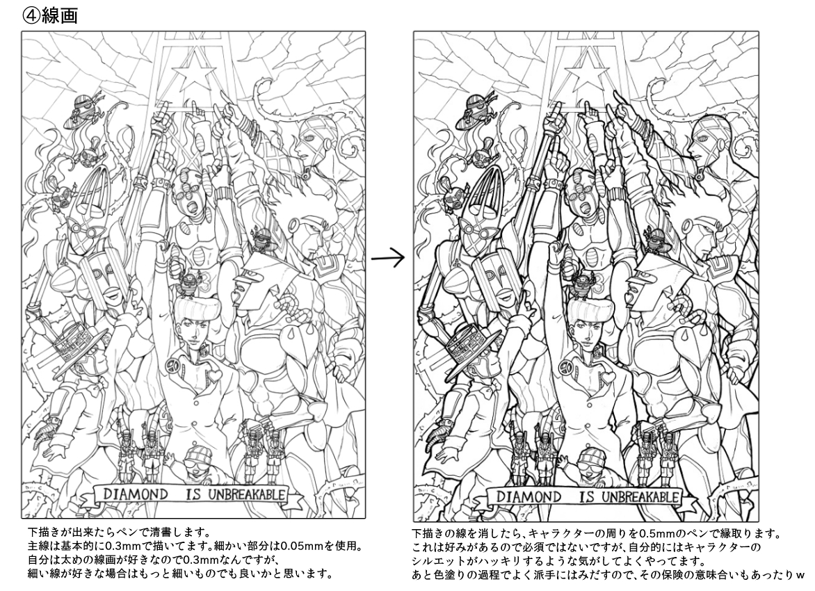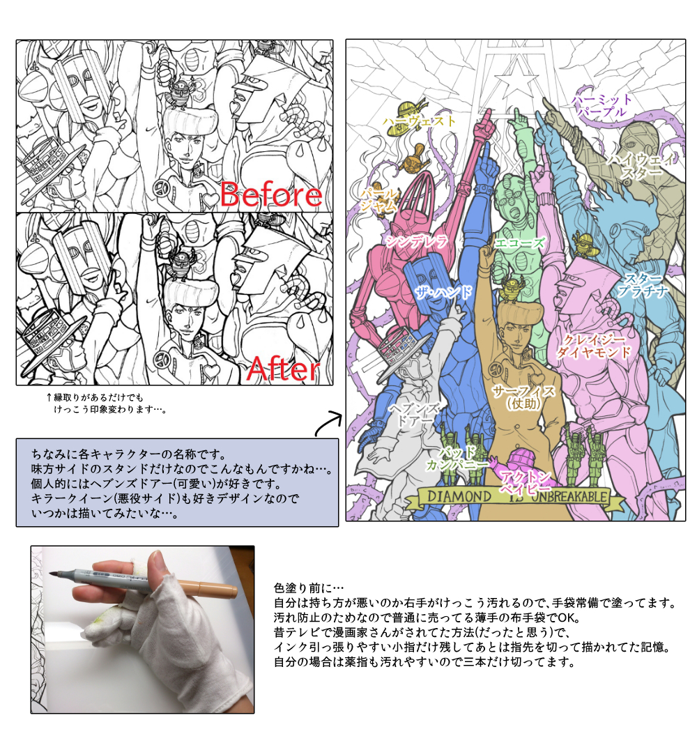 縁取りはあるアメコミのアーティストの方がされてた手法を真似したもので、こういう集合絵で