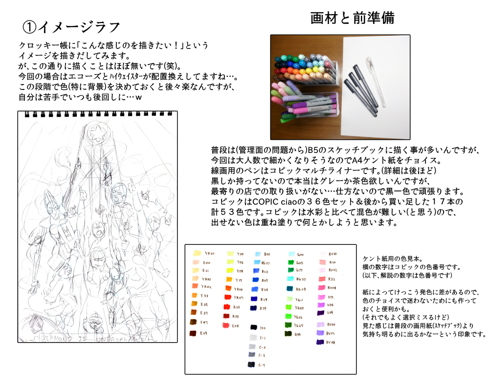 画材についてですが、解説してるように普段は画用紙(スケッチブック)に描く事が多いです。折れたり曲がったりするのが嫌なので…それならいっそ綴じてあった方が管理しやすいだろうと(笑)。