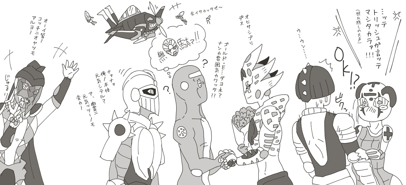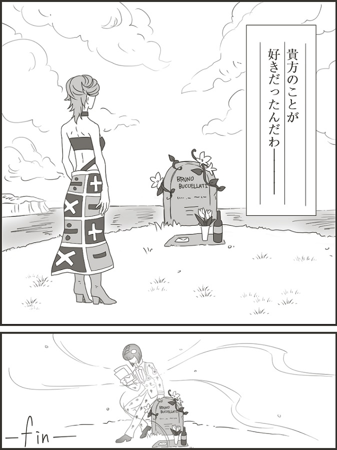 あと描いてから気づいたんですが、メローネって確か最後は蛇に噛まれて死亡だか再起不能だかになってたような……(汗) でもイメージ的に爬虫類っぽいんだよなぁ……。